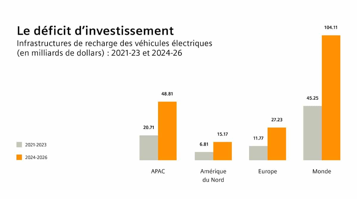 C’est ce qu’estime une nouvelle étude de Siemens Financial Service, qui indique que le déficit d’investissement mondial pour les infrastructures de recharge sera de 45,25 milliards de dollars entre 2021 et 2023. Et il augmentera même de manière exponentielle pour atteindre 104,11 milliards de dollars entre 2024 et 2026.