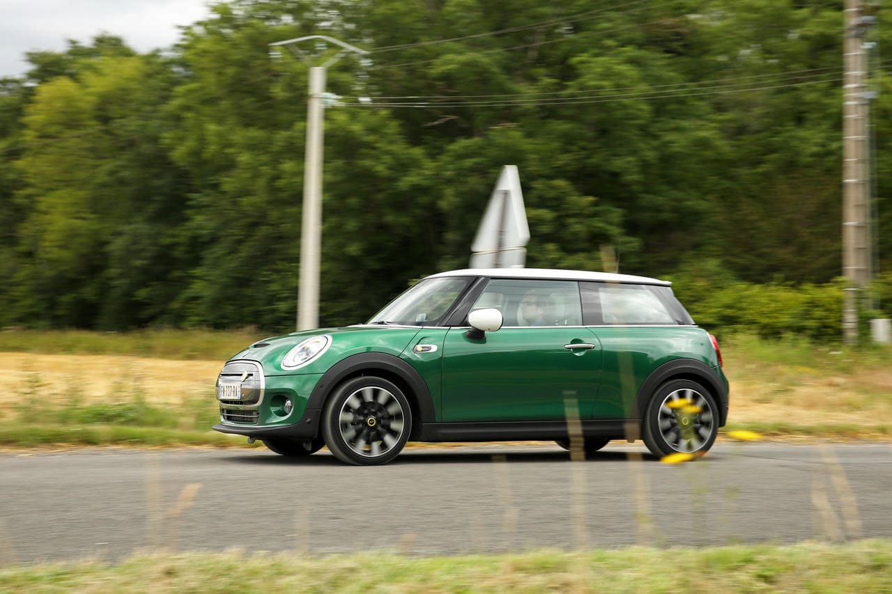 Trois ans plus tard, les deux constructeurs passent à l’acte et posent sur le marché les déclinaisons respectives de leur concept. Capitalisant sur sa bouille toujours craquante, la Mini est fidèle au coup de crayon habituel. Pas d’originalité dans l’absolu donc, puisque cette version est similaire aux autres déclinaisons thermiques de la citadine. Cette Cooper SE fait tout de même des efforts pour s’en distinguer, avec une calandre pleine, plusieurs pièces de carrosserie jaunes et des jantes spécifiques. Hormis sur notre version d’essai, équipée des jantes Roulette Spoke de 17 pouces évoquant les minilite originales.