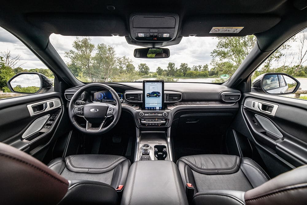 Le conducteur dispose d’un combiné d’instruments numérique dont l’affichage change en fonction du mode de conduite choisi (7 au total). Les commandes sont assez bien placées. Mais les apprivoiser demandera un peu d’habitude et elles s’avèrent un peu nombreuses sur le volant. L’Explorer est également connecté grâce à l’application Ford Pass Connect (une offre gratuite à vie est incluse dans le prix) qui propose des services adaptés aux hybrides : niveau de charge et de carburant, programmation des horaires de charge, localisation du véhicule, etc.