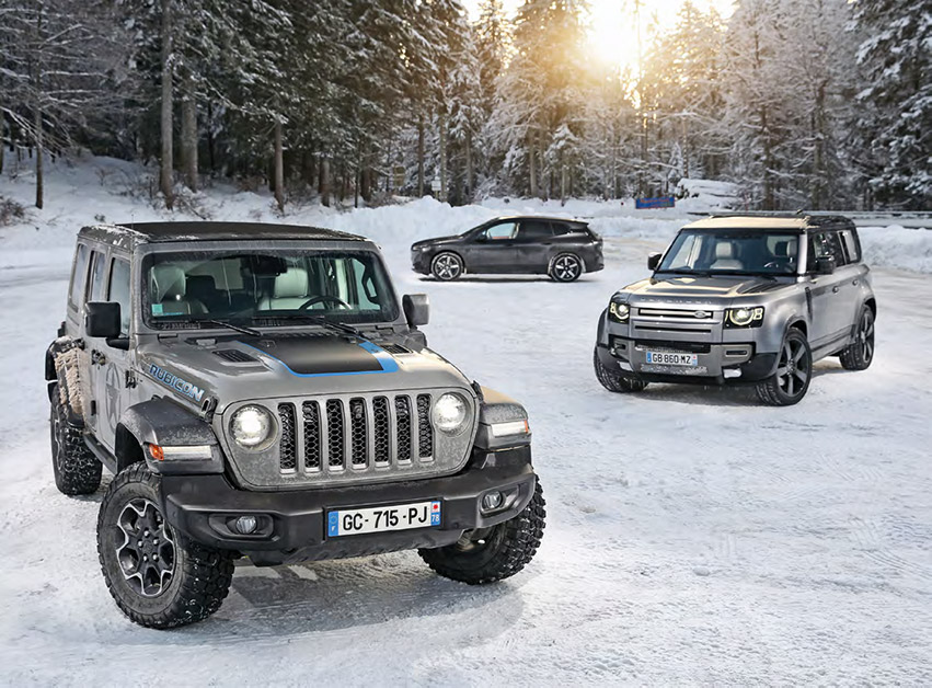 Cette année, le casting était aisé pour notre traditionnel rendez-vous à la neige. Il n’y a certes pas eu de modèle 100% nouveau dans le petit monde des vrais 4×4. Mais deux des plus emblématiques ont gagné en même temps une mécanique hybride rechargeable. Un hasard ? Non, une nécessité ! Car il s’agit là du seul moyen d’échapper au malus écologique maximal dont étaient jusqu’ici affectés les Jeep Wrangler et Land Rover Defender. Au point que l’Américain a même éliminé toutes les autres versions de son catalogue. Cela signifie aussi qu’il n’existe plus chez nous qu’en version longue Unlimited à cinq portes : impossible en effet de caser la batterie de 17,3 kWh dans la version courte qui est pourtant l’héritière directe de la Jeep Willys du Débarquement. La problématique est la même chez Land Rover, mais le Defender se décline toujours dans d’autres motorisations à empattement court, y compris utilitaires et donc non soumises au malus (voir le dossier Defender de notre numéro 69). Les points communs ne s’arrêtent pas là puisque ces deux baroudeurs font appel au même fournisseur pour leur transmission. C’est en effet le spécialiste allemand ZF qui apporte une solution technique clé en main. Sa boîte automatique à 8 rapports, adoptée par quasiment tous les constructeurs automobiles haut de gamme, se décline en une version électrifiée où le convertisseur de couple est remplacé par un moteur électrique. Sur ces modèles qui comptent parmi les derniers du marché à revendiquer de véritables capacités de franchissement, c’est couplé à une boîte de transfert, pour proposer une gamme courte. Les deux marques ont dû s’atteler avant tout à un travail de mise au point. Nous avons déjà pu constater à quel point, lors de nos précédents essais cette année, l’électrification apportait en douceur et en efficacité lors des passages les plus difficiles. La progressivité est incomparable. Il nous restait à voir ce que donnaient ces deux modèles sur la neige.